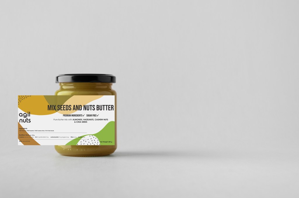 As the art director and brand manager of Agil Nuts, I focused on rebranding and redesigning our jar labels during this product development phase. Agil Nuts is a young, colorful, and easygoing brand. I conducted extensive online research and drew inspiration from many talented designers on Pinterest and Behance. After various sketches, we arrived at a minimalistic design featuring the main colors of each product, fluid and simple. My goal was to emphasize the simplicity and purity of our products. Our nut butters contain no additives, no sugar, no salt, and no preservatives. The new design reflects this purity and our commitment to providing wholesome, natural products.