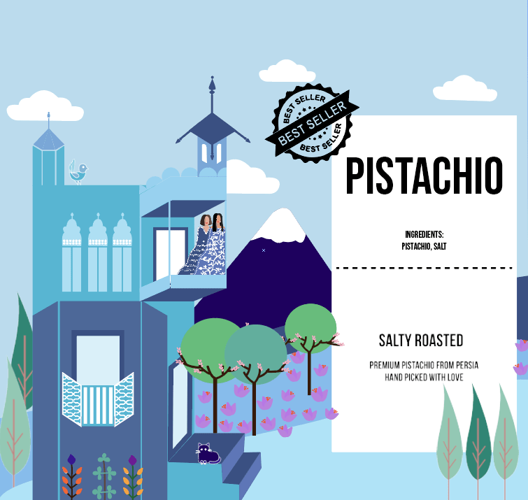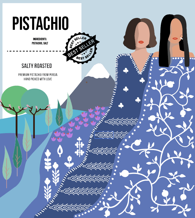 For the design, I created numerous sketches, aiming to craft something vibrant and visually appealing that also reflected our story and Persian heritage. The main elements I wanted to highlight were Persian gardens, pistachio and almond trees, and us—two young women—along with Persian cats and the beauty of nature.